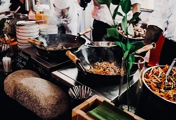 Горячие закуски также впечатляют: демонстрационное приготовление паэльи с морепродуктами, вафельные брускетты с лососем и ростбифом, а также блинная станция, где прямо на месте выпекаются домашние блины. Завершают меню анимационные станции десертов, фруктовое ассорти и мини-десерты. Компания «3F Кейтеринг» бережно заботится о каждом аспекте вашего мероприятия.