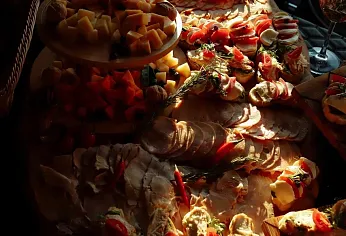 Меню также включает сэндвич-эклеры с разнообразными начинками, такими как ростбиф с творожным сыром и тапенадом из маслин, Mozzarella с томатами и соусом "Pesto", а также семга слабого соления с листьями Rucola. Анимационные станции холодных закусок добавят интерактивности: гости смогут попробовать шпинатные вафли с хумусом и салат-бар из свежих овощей. Сырное ассорти, представленное сырами Dorblu, Parmigiano, Chevrette и Brie, подается с ягодами, виноградным chutney, цветочным медом и орехами.