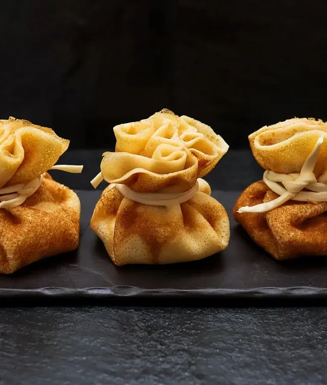 | Блинный мешочек с тартаром из тигровых креветок, шампиньонами и соусом "Saffron" | 120 | 10 | 1200 |