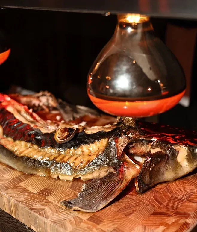 | Карвинг станция. Каспийский осётр запечённый с пряными травами и лаймом. Сервируется с муссом из зелёного горошка, мини-шпинатом и икорным соусом | 6000 | 1 | 6000 |