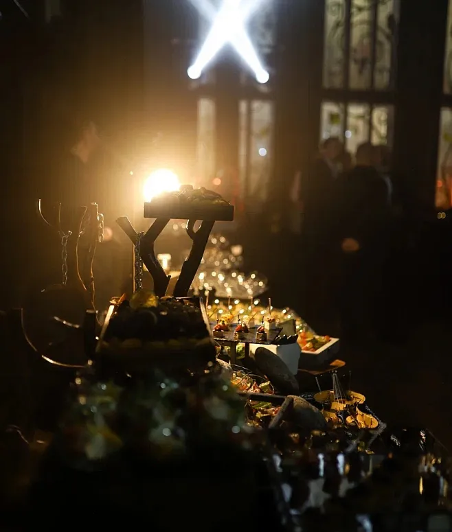 Гастрономическая часть включает ассорти изящных канапе и свежие мини-салаты. Особенность предложения — румяные соленые пирожки, добавляющие нотку домашнего уюта. Горячие закуски сервируются через chafing dish service, что позволяет сохранять их тепло и аромат. Сезонные фрукты и нежные мини-десерты служат отличным завершением, а прохладительные напитки доступны гостям на протяжении всего праздника.