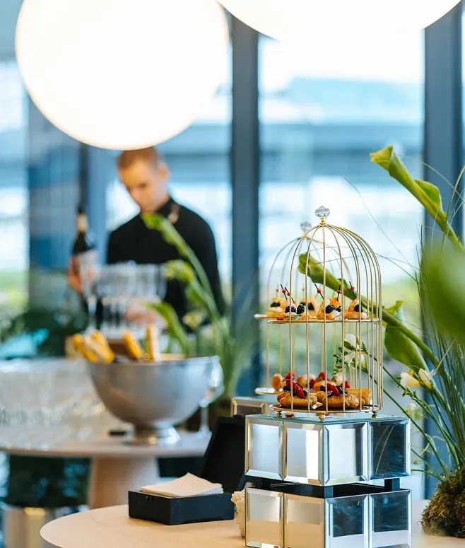 Основной акцент сделан на интерактивной подаче: гостей впечатлят анимационные станции с холодными и горячими закусками, где повара демонстрируют кулинарное мастерство. Меню богато изысканными канапе, сочными мини-бургерами и премиальными позициями BBQ. Изящным завершением вечера станут сезонные фрукты, авторские десерты и безалкогольные напитки.