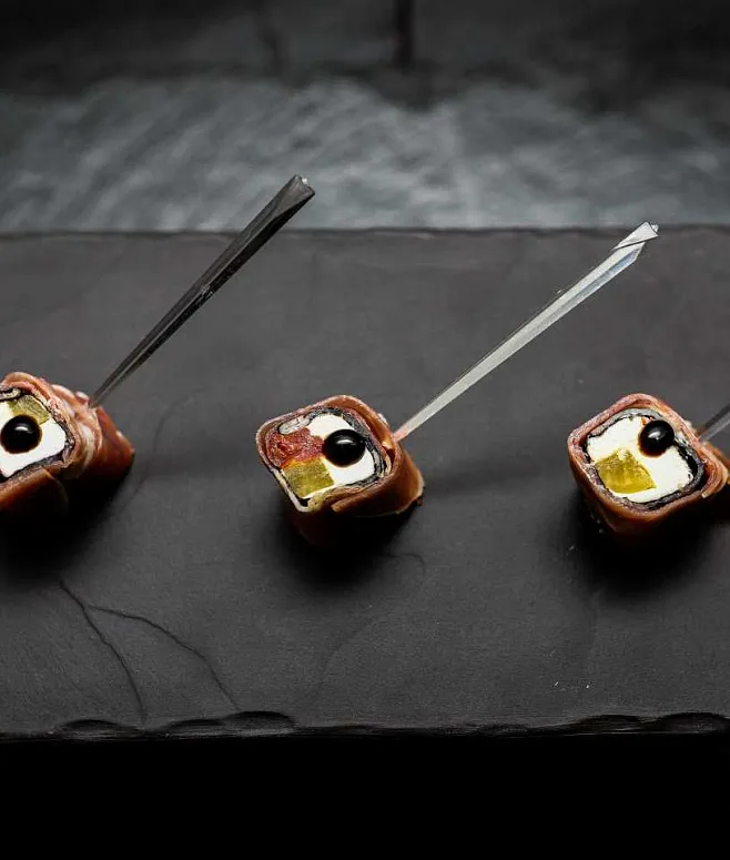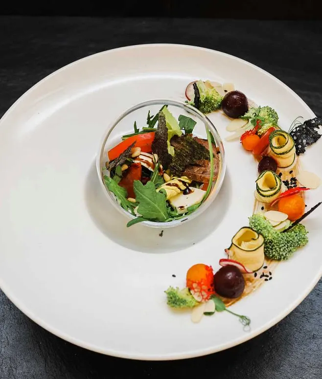 Коллекция холодных закусок включает ассорти изысканных канапе, брускетты и легкие мини-салаты. Горячая линия отличается особым изыском: блюда запекаются в порционных рамекинах и подаются в виде аппетитных мини-шашлычков. Гастрономический ансамбль дополняют сезонные фрукты, авторские десерты и безалкогольные напитки.