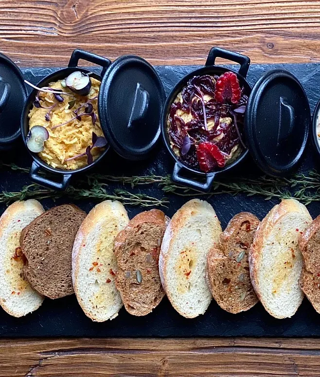 | Паштетная стация. Паштеты из куриной печени / утки / кролика / сервируются с пряным сливочным маслом, миксом злаков, черносмородиновым конфитюром и грушевым Chutney, на домашних оладьях | 3000 | 3 | 9000 |