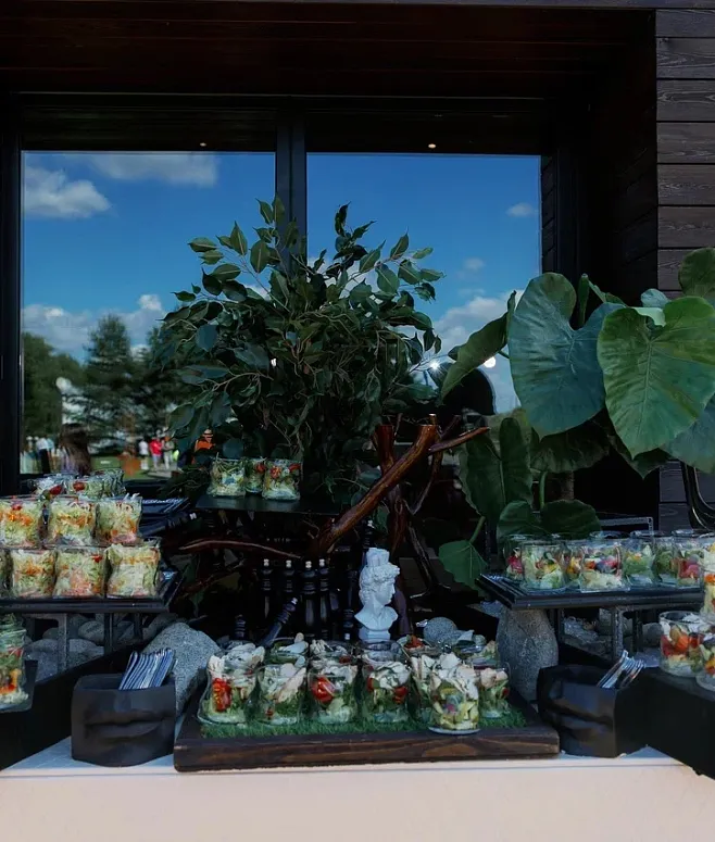 Меню фуршета составлено с учетом разнообразия вкусов: канапе в ассортименте, сытные сэндвичи на тостовом хлебе, свежие мини-салаты и горячие закуски в формате chafing dish service. Гостей ждут ароматное ассорти из сезонных фруктов, изящные мини-десерты и широкий выбор безалкогольных напитков. Обслуживающий персонал работает на протяжении всего мероприятия, обеспечивая комфорт каждому гостю.