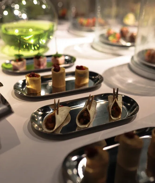 В центре гастрономической композиции — воздушные сэндвичи на круассанах и разнообразные канапе. Легкие мини-салаты дополняют стол, а горячие закуски подаются в мармитах, исключая необходимость использовать громоздкие анимационные станции. Свежие фрукты и десерты становятся сладким финалом трапезы.