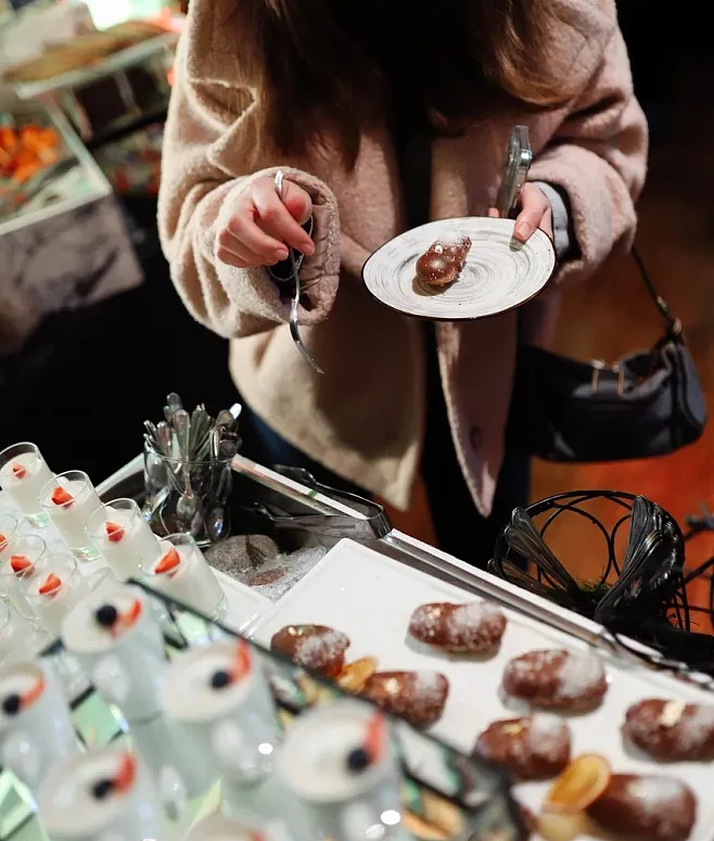 В гастрономический сет входят разнообразные канапе, брускетты и свежие мини-салаты. Главный акцент сделан на горячих позициях BBQ, которые добавляют столу сытности без необходимости монтировать сложные анимационные станции. Сезонные фрукты и десерты гармонично завершают трапезу.