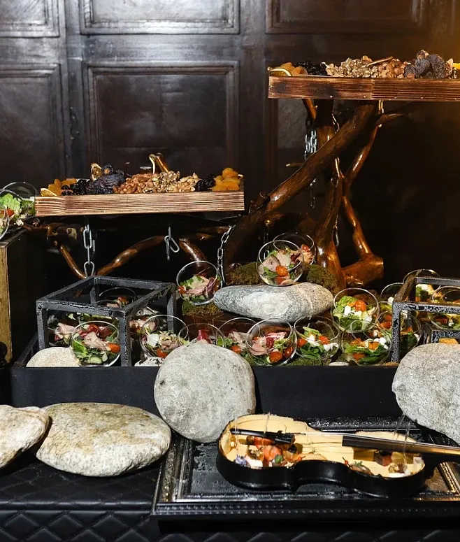 Холодная закусочная линия включает ассорти канапе, классические сэндвичи на тостовом хлебе и свежие мини-салаты. Горячая подача организована максимально вариативно: мы предлагаем как мини-шашлычки, так и другие горячие блюда, сервированные через chafing dish service. Такой подход позволяет обойтись без громоздких зон, как анимационные станции, но при этом удивить гостей выбором. Завершают прием сезонные фрукты и десерты.