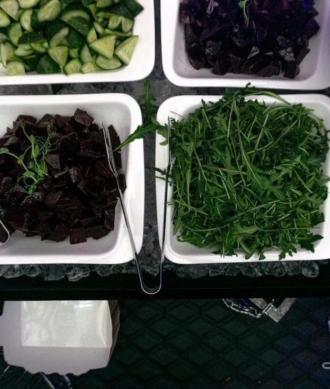 | Салат-бар из свежих овощей: морковь, томаты Cherry, стебель сельдерея, цветная капуста, брокколи, свёкла, огурцы, салат романо, Rucola, листья айсберг, шпинат. Соусы: йогуртовый, Blue Cheese, оливковое масло, бальзамический, соевый | 10000 | 1 | 10000 |