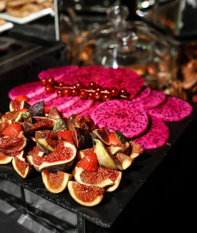 Особенность формата — анимационные станции, где повара готовят и сервируют холодные и горячие закуски прямо в зале. В ассортименте представлены изысканные мини-закуски, горячие блюда в порционных рамекинах, свежие фрукты и десерты с интерактивной подачей, гармонично дополненные безалкогольными напитками.