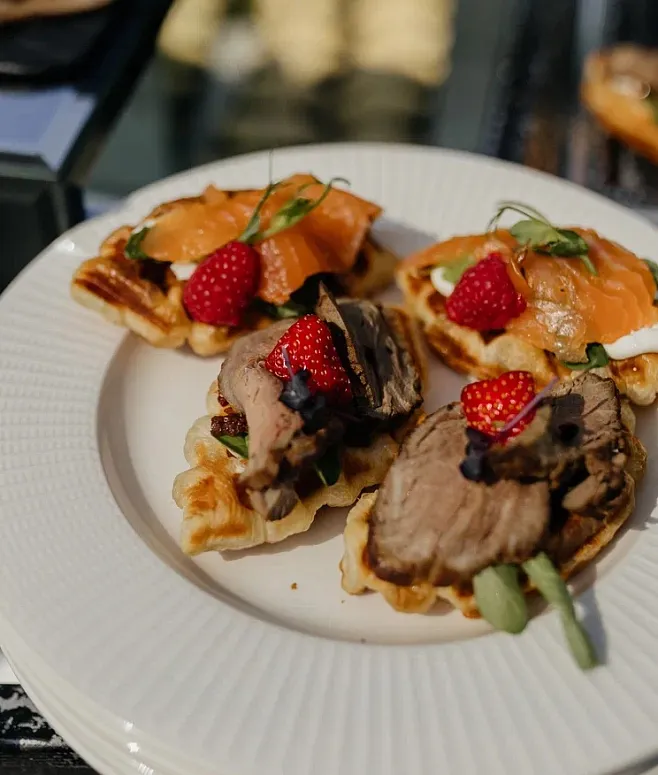 В программе гастрономического вечера — изысканные канапе и хрустящие брускетты, а также интерактивные зоны с холодными и горячими закусками. Анимационные станции десертов и свежие сезонные фрукты идеально сочетаются с линейкой безалкогольных напитков.